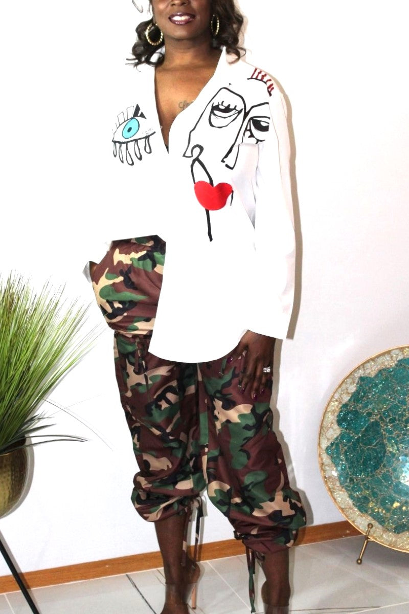 This shirt is wearable art with attitude. Crafted in crisp white fabric, it features a bold abstract face graphic that fuses surrealist flair with pop-art energy. The striking blue eye, dripping in illustrated tears, pairs perfectly with the vivid red lips and expressive linework—turning a classic button-down into a statement of fearless self-expression. Oversized and effortlessly chic, it’s the perfect piece for the trendsetter who paints outside the lines.