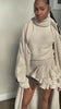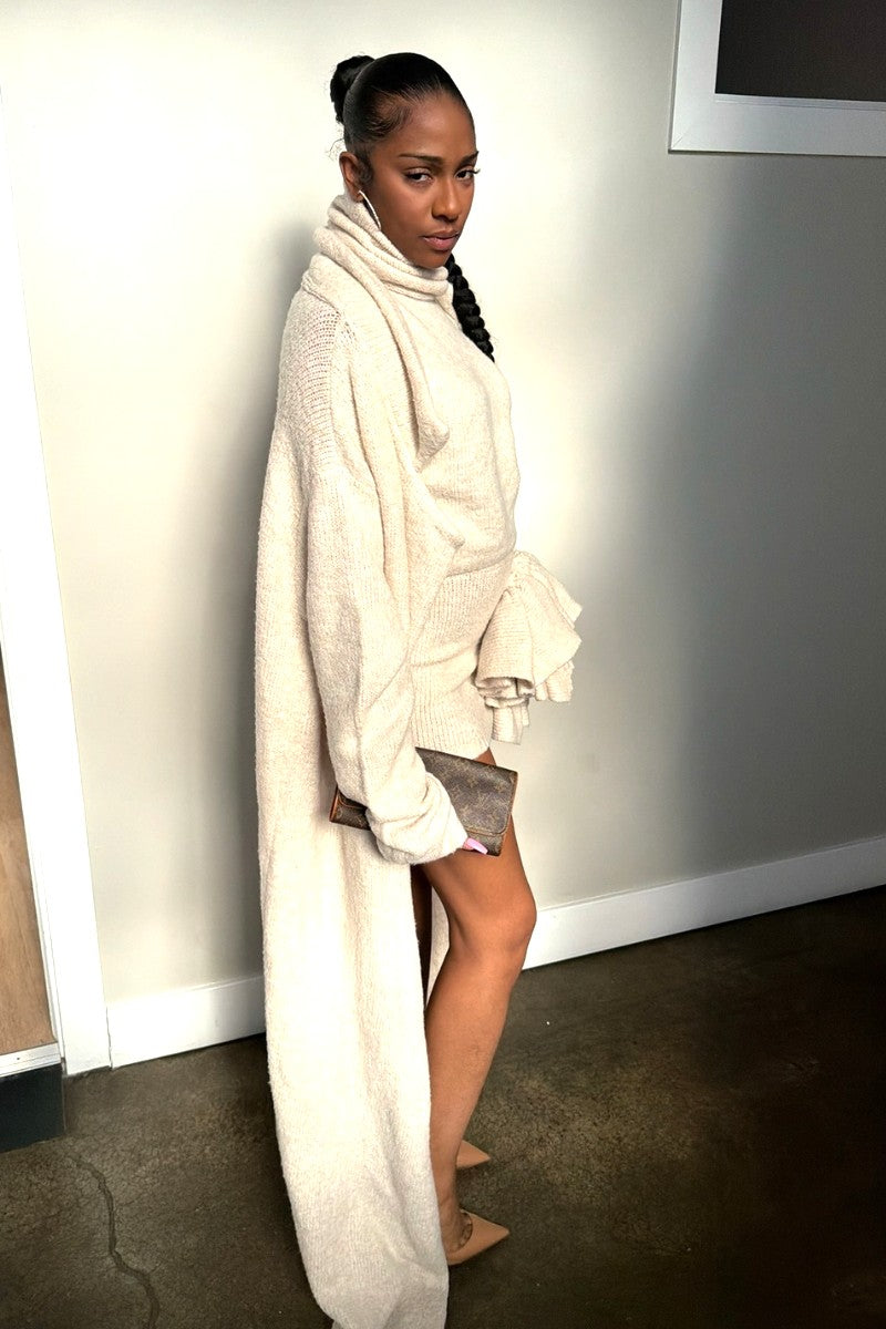 This look is the definition of modern elegance with a high-fashion twist. Featuring a sleek monochromatic palette, it pairs a chic cropped turtleneck with a tailored mini skirt adorned with sculptural floral detailing for a bold yet feminine statement. Layered with a longline coat draped effortlessly over the shoulders, the outfit exudes sophistication and power. The clean lines, luxe textures, and soft neutral tones make it the perfect balance of minimalism and drama—ideal for the woman who loves refined style with a touch of artistry.