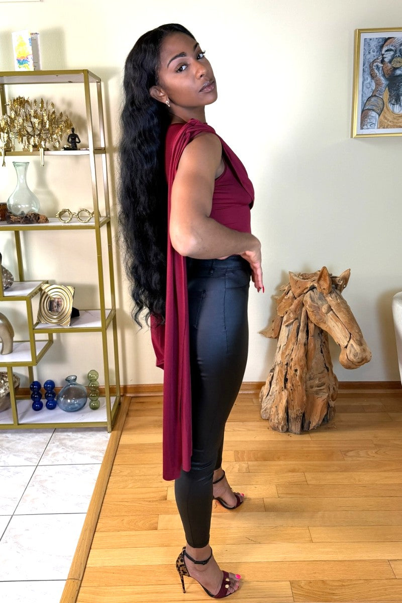 This look is giving modern goddess meets high-fashion drama! Burgandy draped cape bodysuit that oozes elegance, power, and sophistication. The soft, gathered neckline cascades beautifully across the shoulders, flowing into a floor-length cape that moves with every step — pure main character energy. The sleek bodysuit silhouette sculpts the body, making it both sultry and refined.