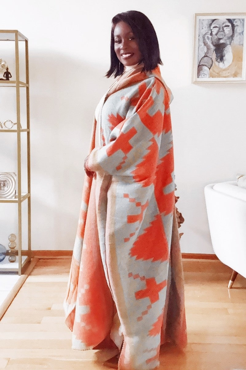 This dramatic hooded kimono sweater is a show-stopping masterpiece — where mystique meets high fashion. 💫 With its flowing, oversized silhouette and painterly blend of earthy green, burnt orange, and golden tones, it creates an ethereal, goddess-like presence. The voluminous drape moves effortlessly with every step, while the deep hood adds a touch of mystery and power. Whether styled over chic shorts or a sleek dress, this piece transforms any outfit into an unforgettable fashion moment.