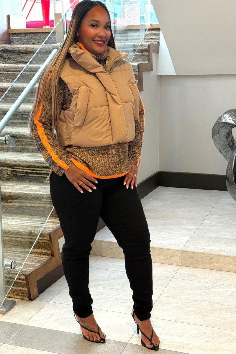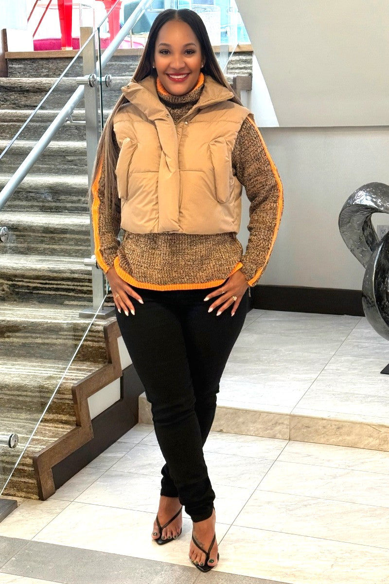 This look is the definition of cool and casual streetwear chic. The cropped black puffer vest adds instant edge with its quilted design and high-neck detail, perfect for layering in transitional weather. Paired with a sleek long-sleeve top and fitted leggings, it creates a modern, sporty silhouette that’s both cozy and stylish. The ribbed knit beanie ties the outfit together, giving it that effortlessly laid-back vibe. Perfect for city strolls, coffee runs, or casual hangouts, this outfit proves that simple layering can still turn heads.
